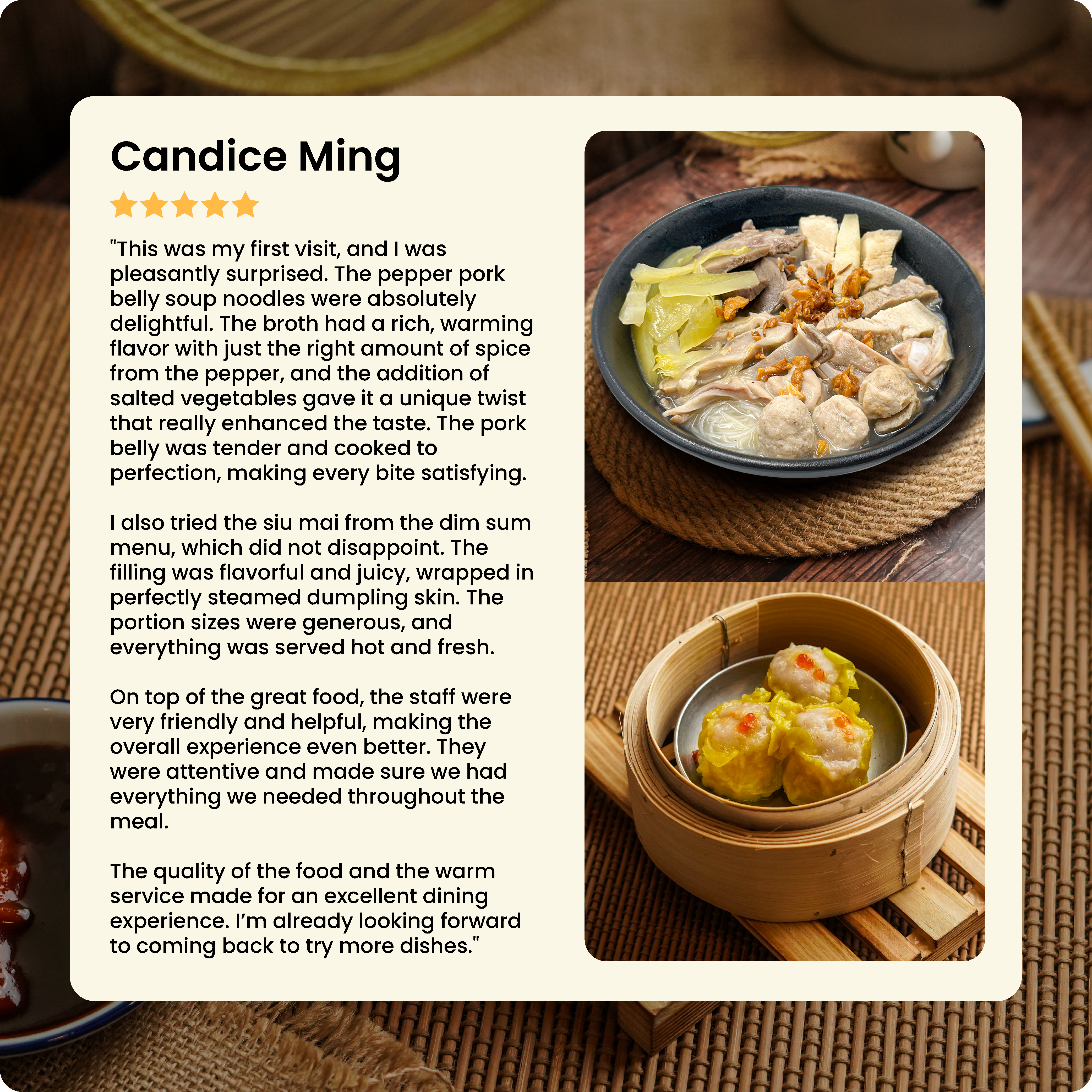 "This was my first visit, and I was pleasantly surprised. The pepper pork belly soup noodles were absolutely delightful. The broth had a rich, warming flavor with just the right amount of spice from the pepper, and the addition of salted vegetables gave it a unique twist that really enhanced the taste. The pork belly was tender and cooked to perfection, making every bite satisfying.